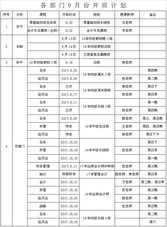 我校九月份开班计划