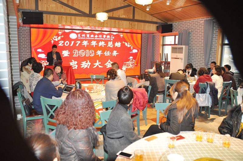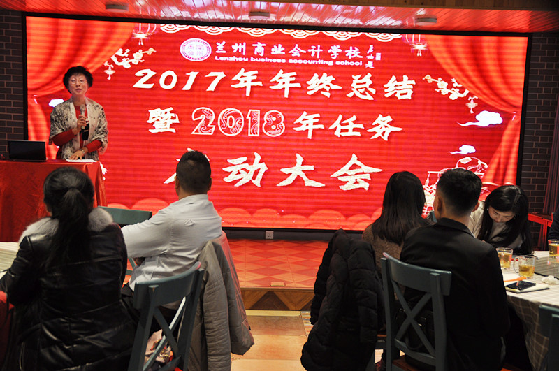 兰州商业会计学校2017年年终总结暨2018年任务启动大会于1月5日上午隆重召开。校长祁绪、副校长杨发中、副校长刘一燕、财务室会计杨娟平、白玉、教务部主任赵雪琴、综合办公室主任李琪及各部门主任一起出席了大会,学校全体教职工共80余人参加了此次会议。本次会议主要就2017年工作进行回顾总结,并对2018年工作进行展望部署,会议由综合办主任李琪主持。