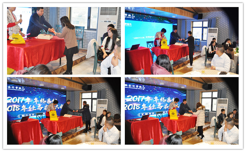 会议第十项,由财务部白会计宣读2017年招生及年终奖励名单,校长祁绪亲自为招生组发放奖金,为全校教职工发放2017年年终奖金。