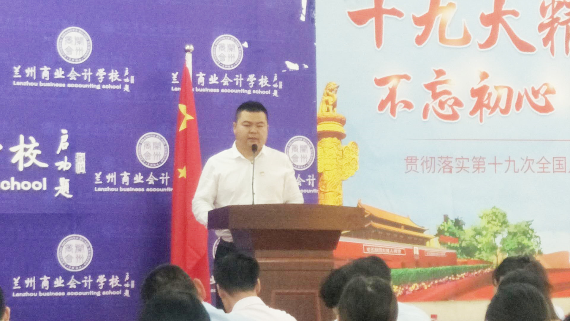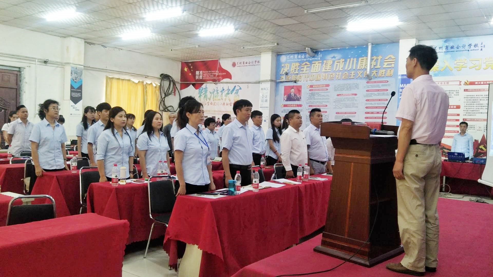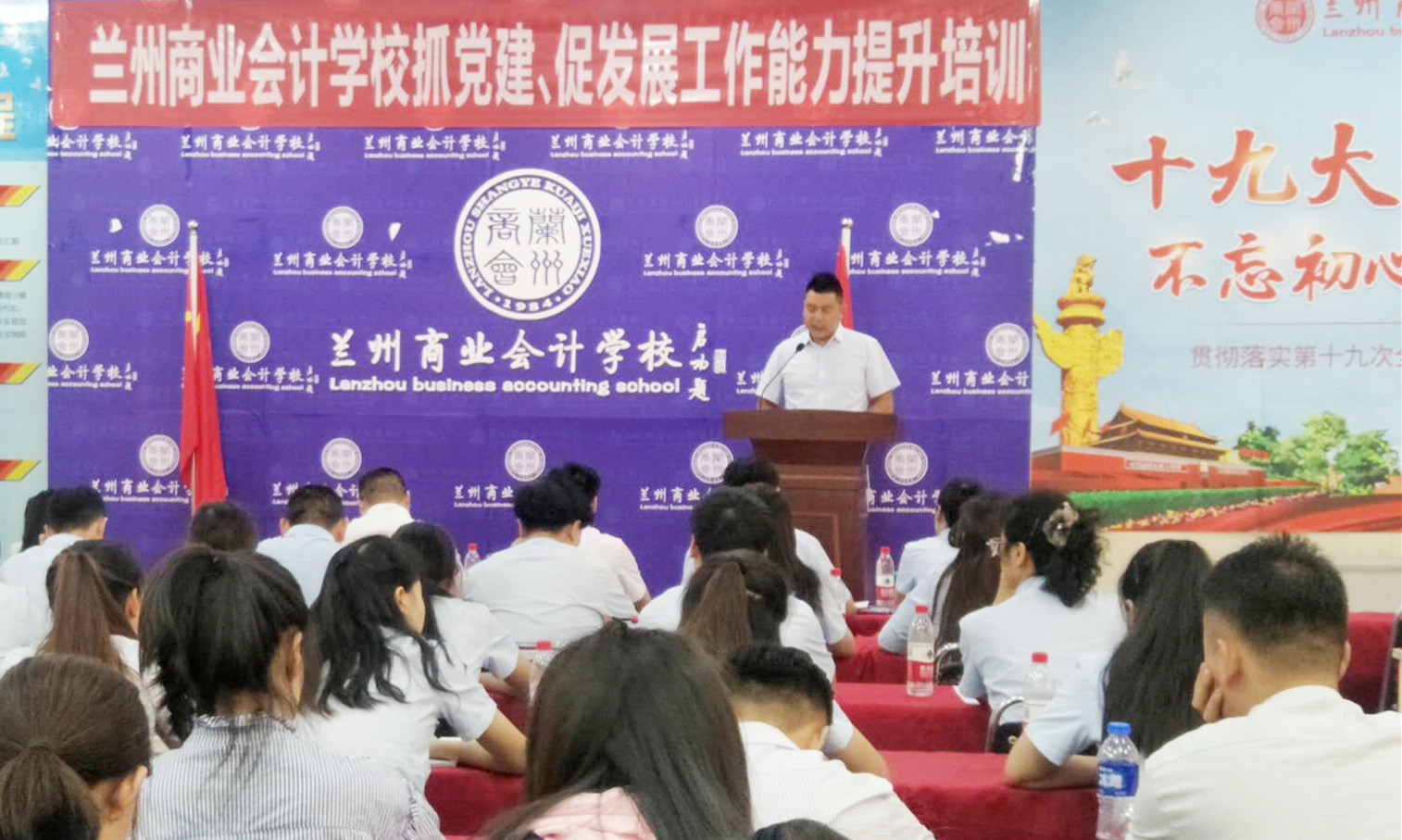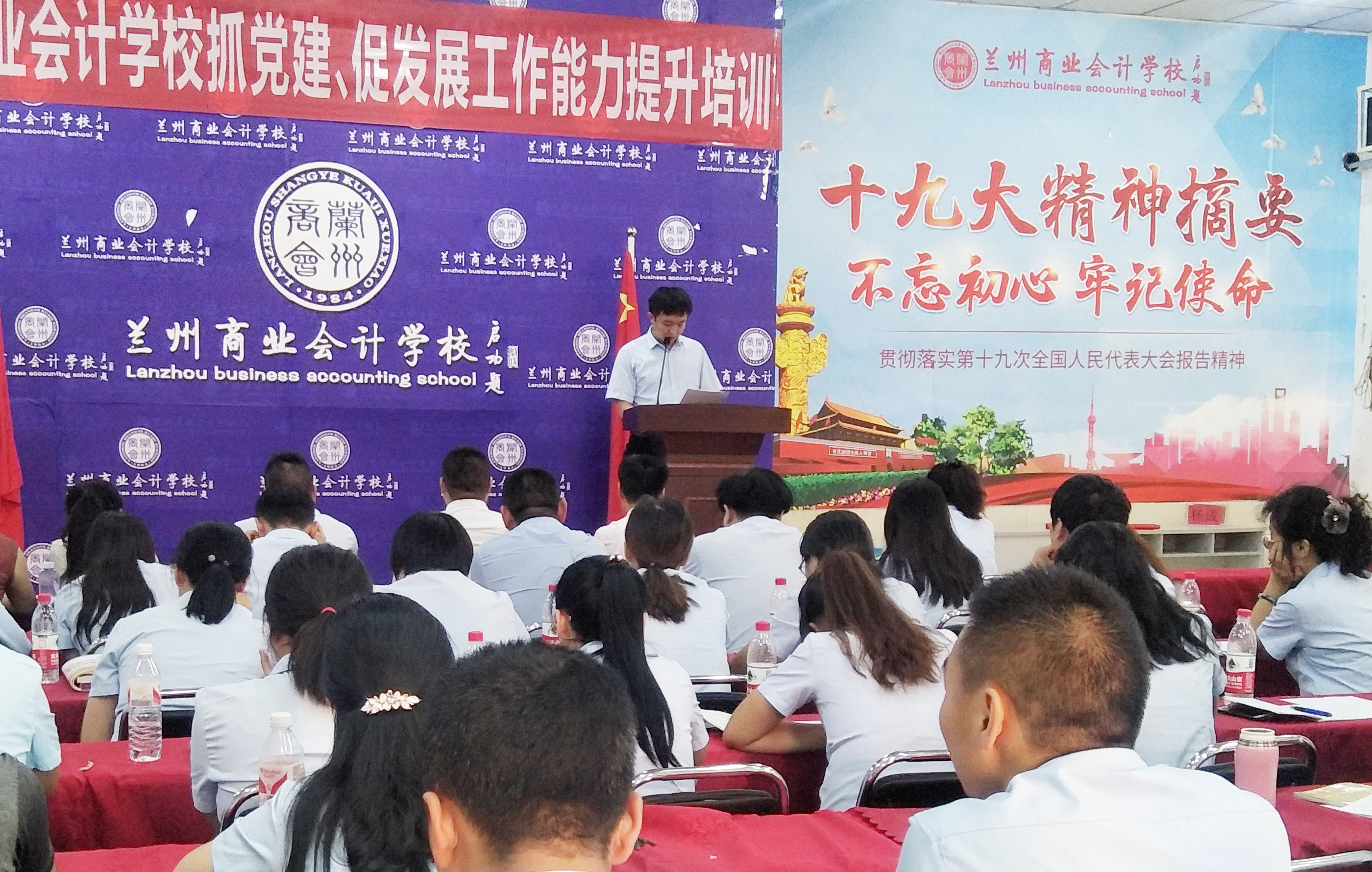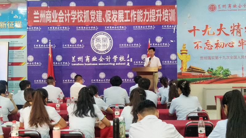 为全面贯彻党的十九大精神,深学笃用习近平新时代中国特色社会主义思想,进一步提升学校教职工的工作能力和政治素养,促进学校党建与学校发展有机融合,兰州商业会计学校于2018年8月29日下午2:00在学校多功能会议室召开“兰州商业会计学校抓党建、促发展工作能力提升培训”,学校党员、入党积极分子及全体员工参加了此次培训,培训会议由兰州商业会计学校党支部书记王今强组织召开。