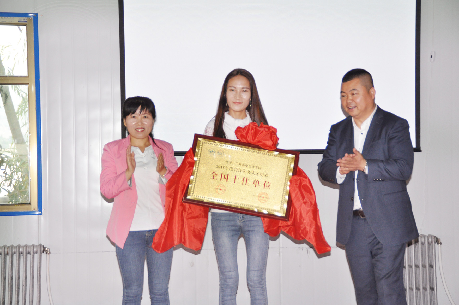 兰州商业会计学校在2018年的发展中也取得了不小的成就,就在教师节来临之际,兰州商业会计学校喜获“2018年度会计实务人才培养全国十佳单位”荣誉称号,学校祁校长、赵副校长、教务部甘主任共同展示这一荣誉,与全校教职员工分享这一喜讯。