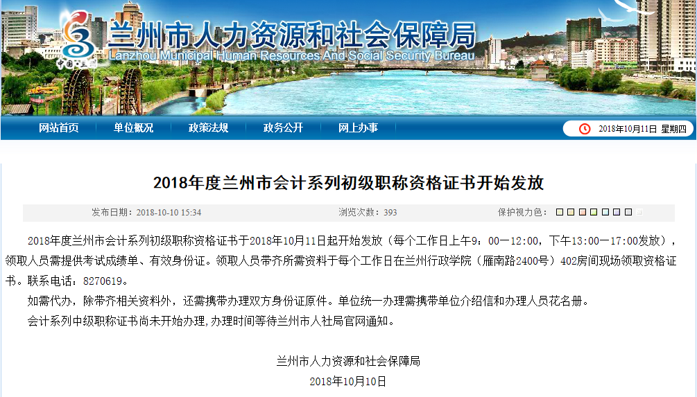 2018年度兰州市会计系列初级职称资格证书开始发放