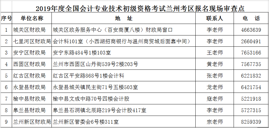 3.兰州市设立了9个报名审核确认点(地址和联系电话见附件)。兰州市财政局主要负责全市报名组织协调、政策解答、报名信息汇总和网上缴费对账,请报考人员在公告的报名现场审核点报名审核。