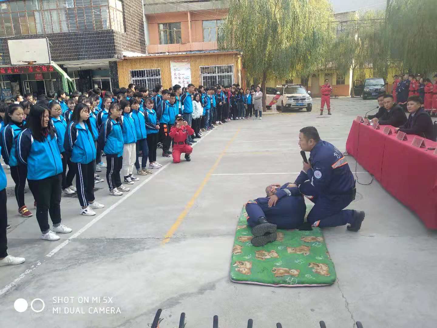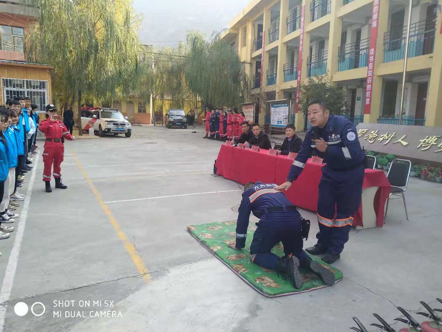 (学生参与自护自救演练)