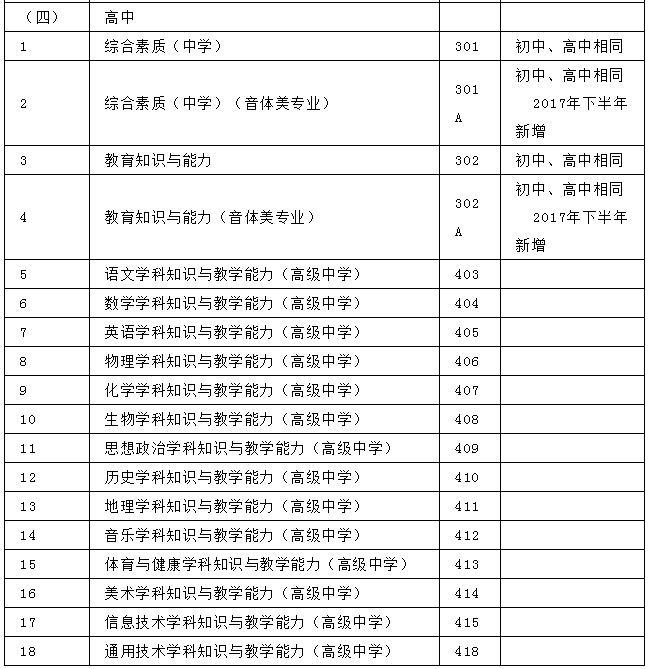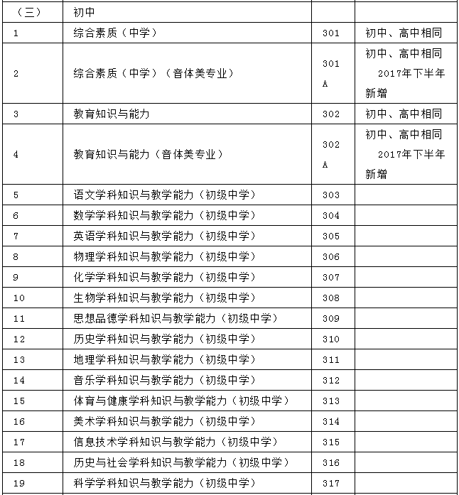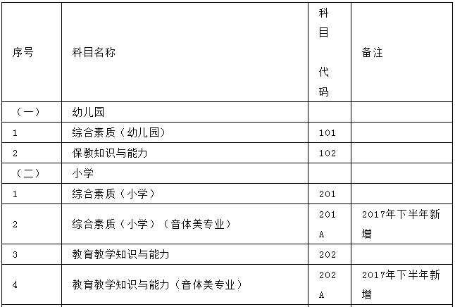 1.为完善中小学教师资格考试制度设置,加强中小学音、体、美专业教师队伍建设,从2017年下半年考试开始,对音、体、美专业考生的笔试公共科目一、科目二(科目代码:201、202、301、302)实行单独编码(相应科目代码:201A、202A、301A、302A),考试内容暂与原科目相同。实行单独编码后,音、体、美专业考生在笔试报名时应选报单独编码的公共科目。取得科目201A、202A合格的考生,面试仅限于参加小学类别音、体、美专业科目;取得科目301A、302A合格的考生,面试仅限于参加初中、高中、中职文化课音、体、美专业科目。考生已获得科目201、202、301、302合格成绩,可相应替代科目201A、202A、301A、302A合格成绩;考生已获得科目201A、202A、301A、302A合格成绩不可替代科目201、202、301、302合格成绩。