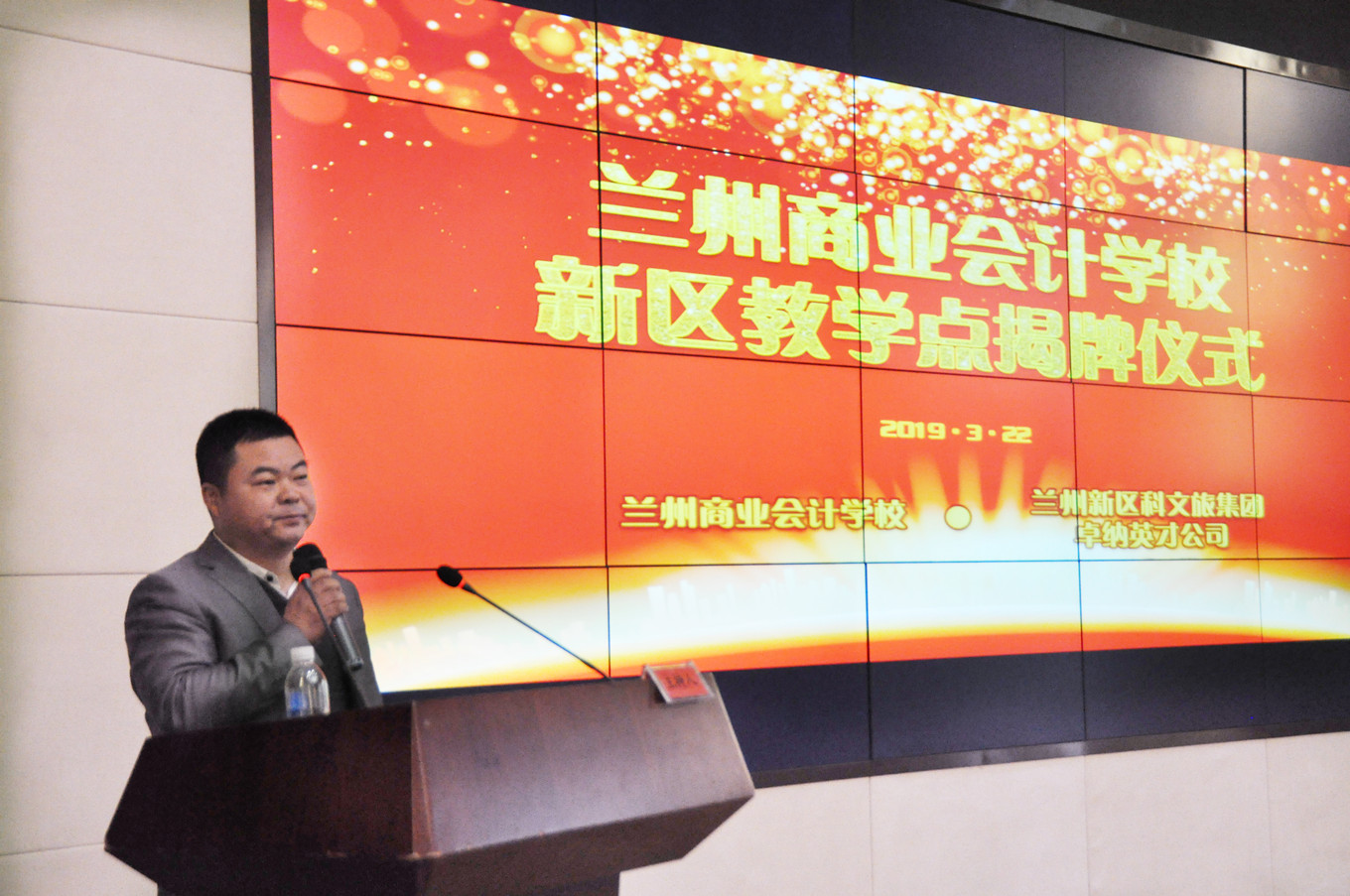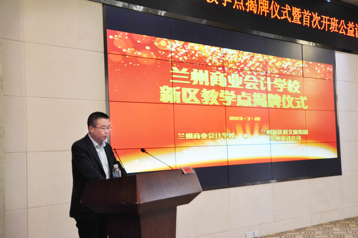 2019年3月22日,由兰州商业会计学校、兰州新区科文旅集团联合举办的兰州商业会计学校新区教学点揭牌仪式暨首次开班公益讲座在兰州新区孵化大厦东裙楼多功能厅隆重举办。兰州新区科文旅集团董事长助理杜康、兰州新区科文旅集团教育公司负责人张晶、科文旅集团卓纳英才公司副总经理孟生蕤、王琦,兰州商业会计学校校长祁绪、书记王今强、副校长赵雪琴等领导出席了本次活动。活动吸引了兰州新区各企事业单位一百多名财务管理人员及会计人员参加。活动由兰州新区科文旅集团教育公司负责人张晶、兰州商业会计学校综合办公室主任李琪主持。
