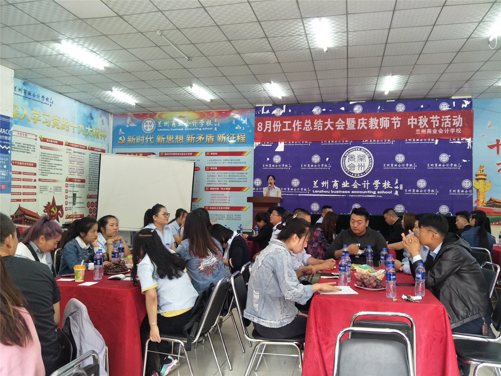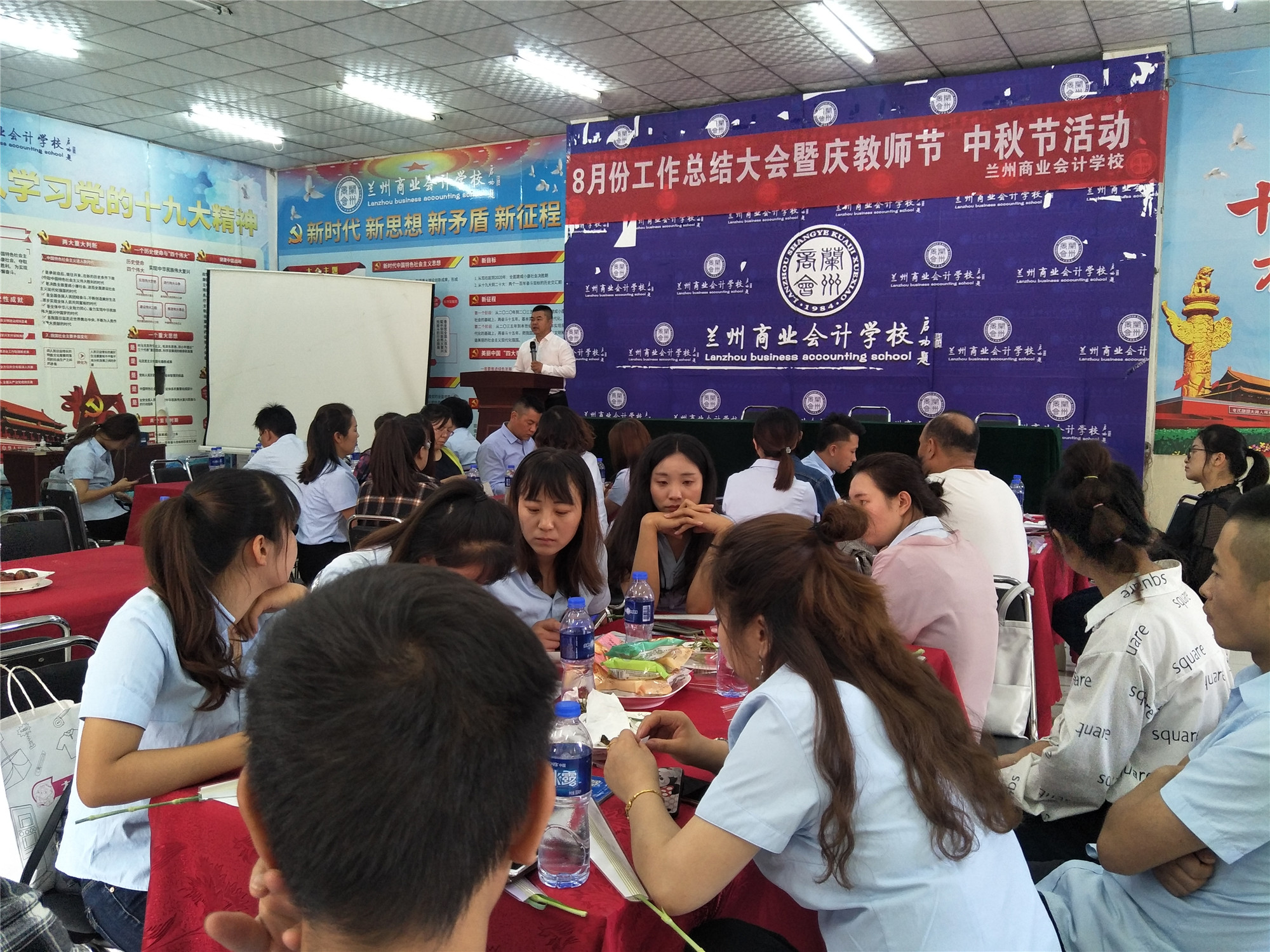一年年春华秋实,一载载桃李芬芳,九月因赋予了教师职业的敬重而更加丰盈。在秋韵荡漾的日子里,兰州商业会计学校迎来第35个教师节,值此之际,为加强教师团队的合作与交流,使全体教职工度过一个愉快的节日,兰州商业会计学校于2019年9月10日在五泉校区多功能厅召开了8月份工作总结大会暨庆教师节、中秋节活动。学校校长祁绪、副校长杨发中、副校长赵雪琴、副校长王文首、兰商人力资源有限公司王经理、各培训分部主任以及全体在校员工出席了此次会议,会议由综合办公室主任李琪主持召开。