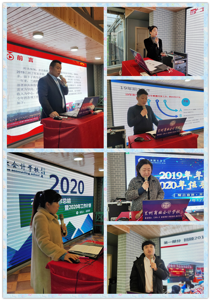 大会上,兰商教育各板块负责人做了2019年度工作汇报,总结2019年各项工作取得的业绩和成果,谋划新一年各板块发展的目标和思路。各板块负责人表示:2019年,在学校校长的领导下,经过全体教职员工的共同努力,取得了较大成绩。各部门将在新的一年,承载新的梦想,开启新的篇章、新的征程,砥砺前行、共创辉煌。