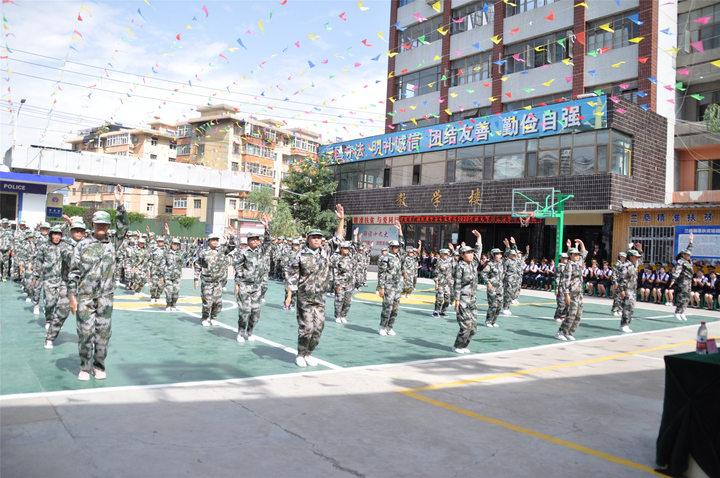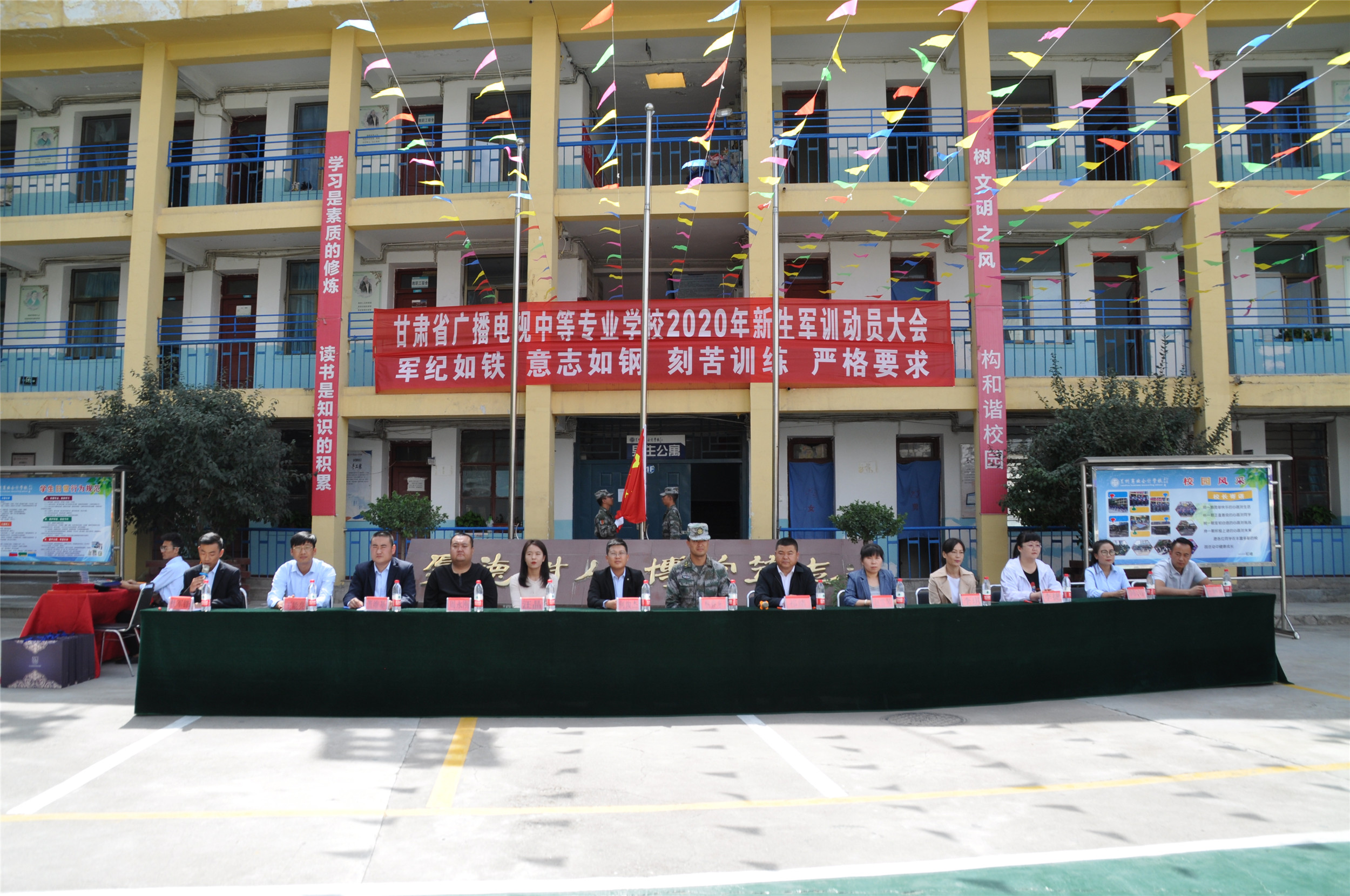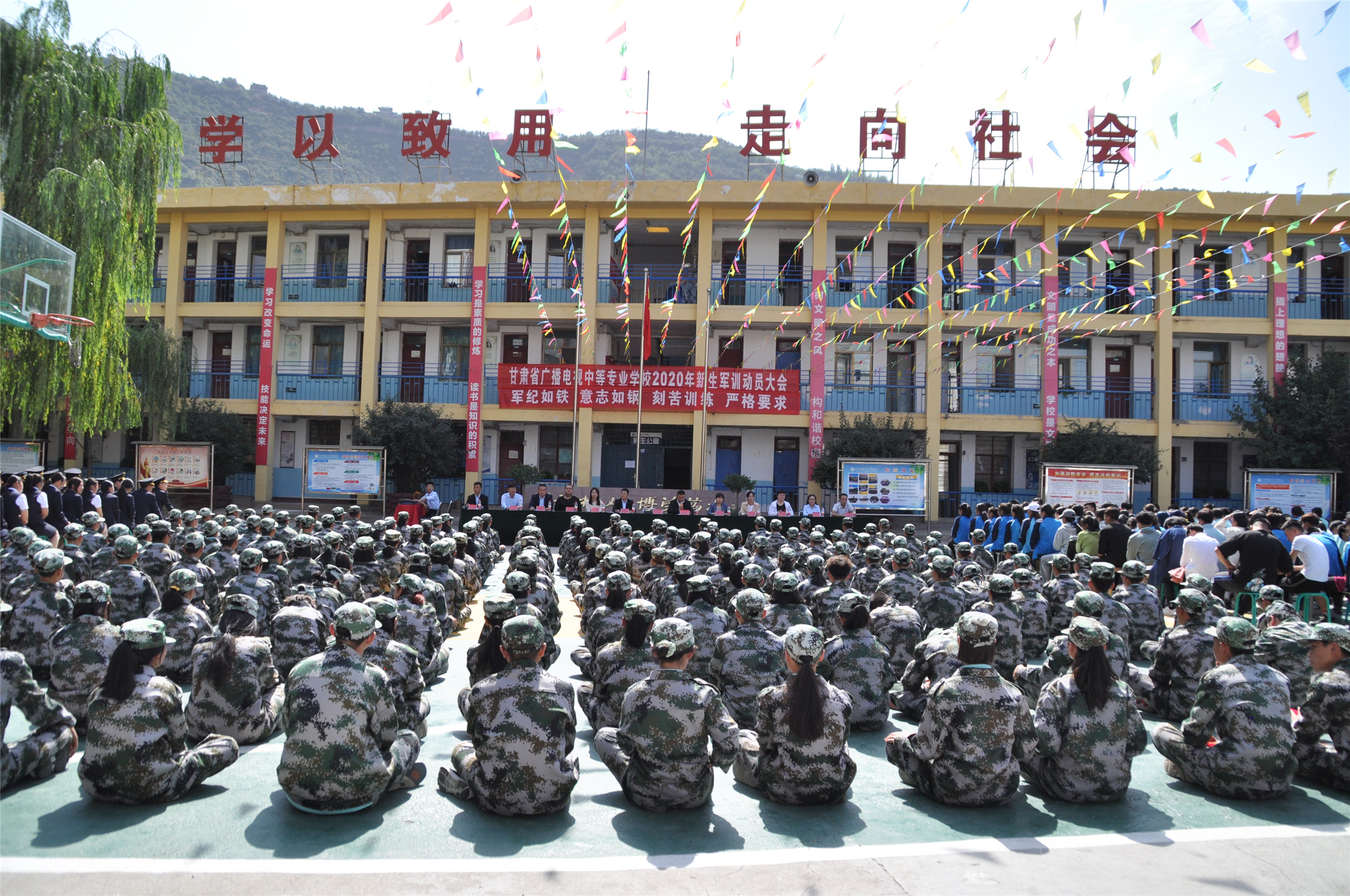 2020年9月6日,甘肃省广播电视中等专业学校(兰商校区)2020级新生军训汇报表演暨开学典礼在校园篮球场上隆重举行,兰商校区校长祁绪、承训单位领导蔡春东同志、副校长赵雪琴、综合办主任李琪、教务部主任李捷、校区主任何俊杰、学生科科长董维基、就业办主任周永刚等领导出席,各班班主任及学校全体在校学生参加了新生军训汇报表演暨开学典礼,典礼由校团委书记杜军锋老师主持。