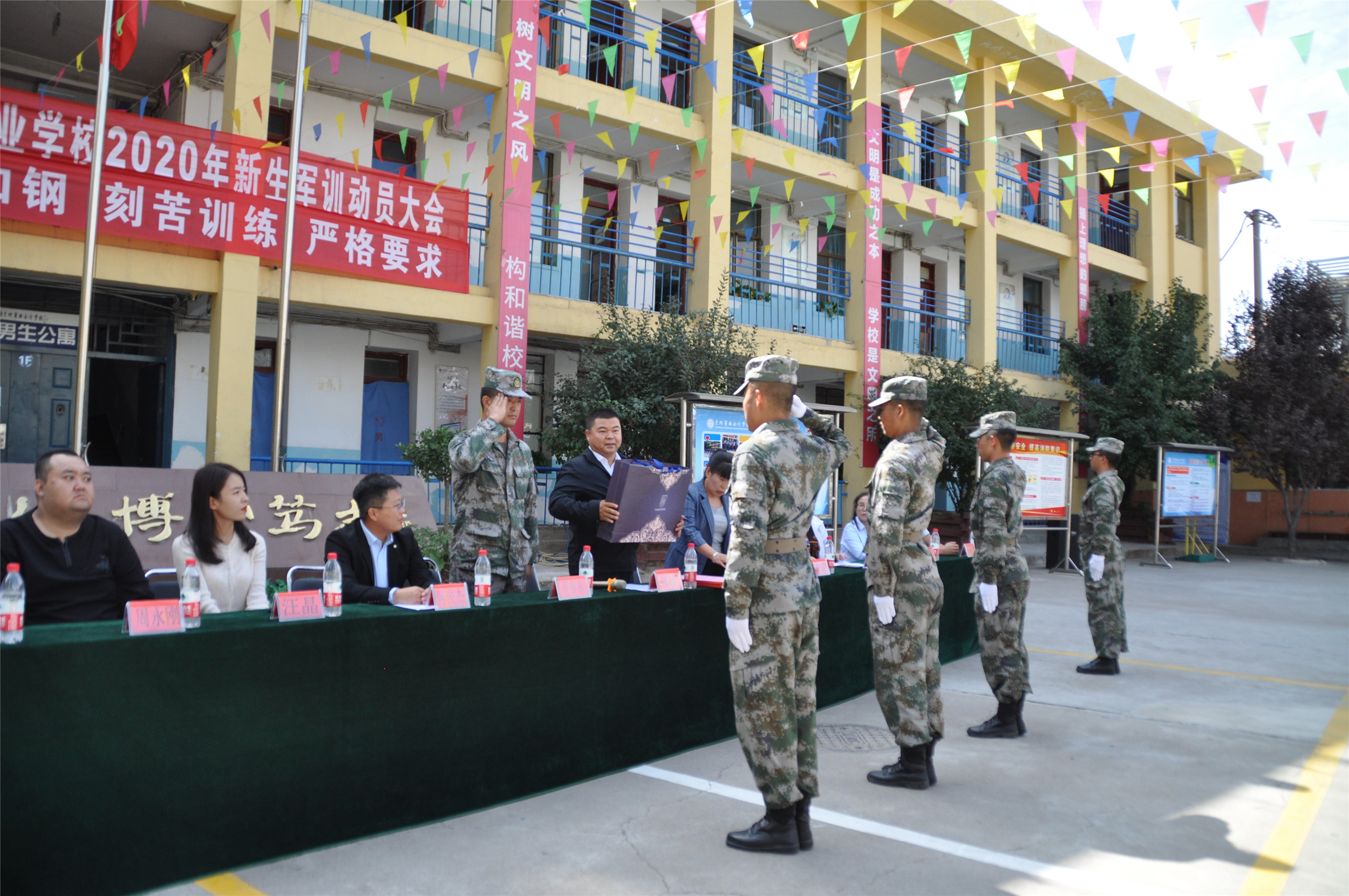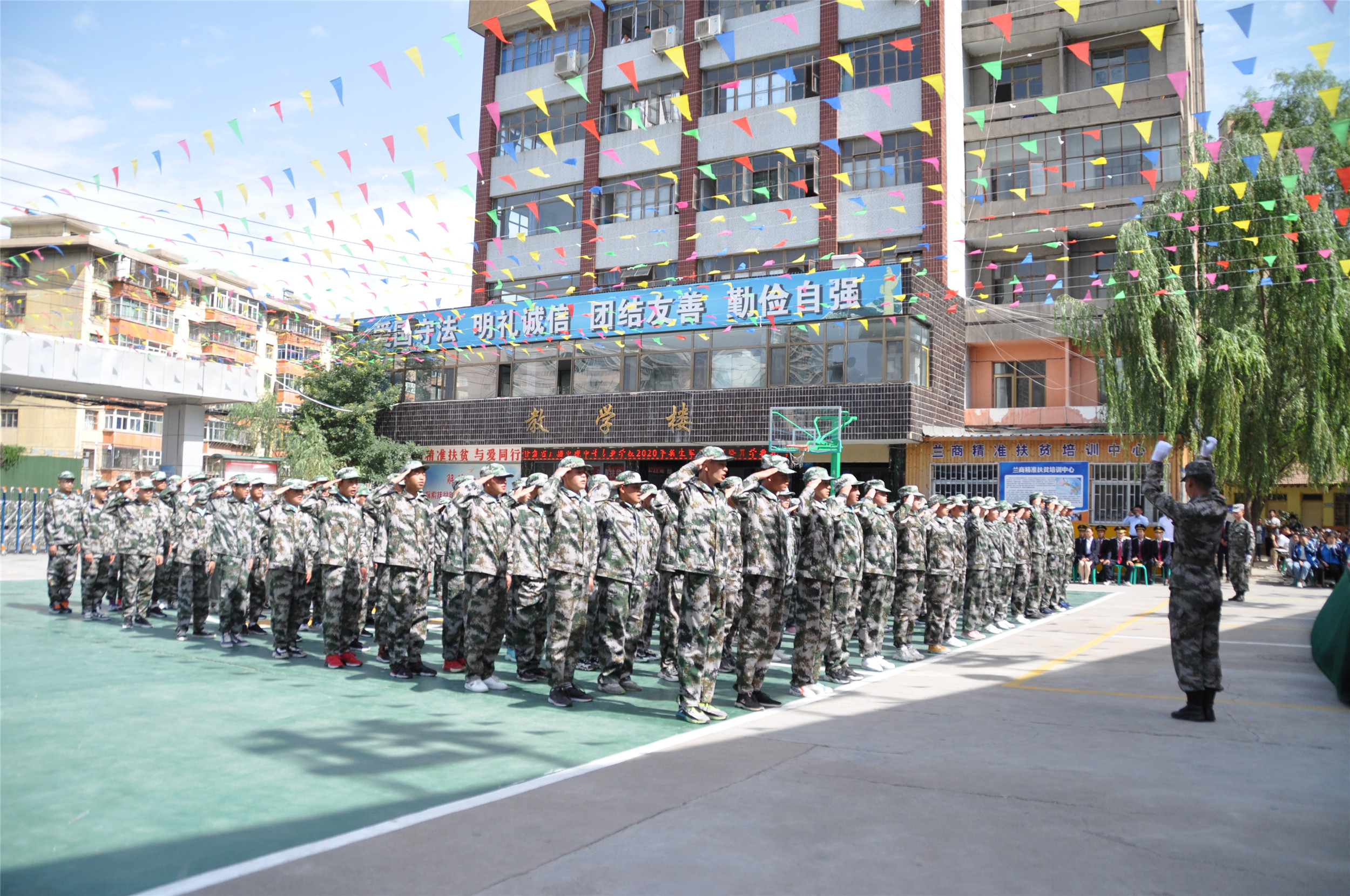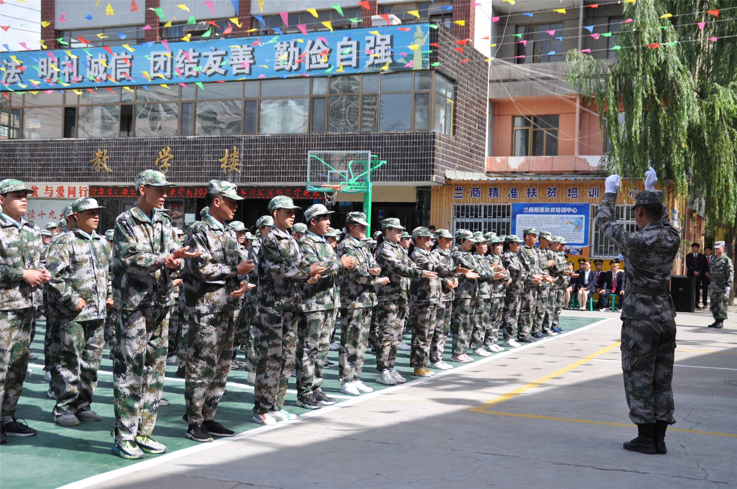 2020年9月6日,甘肃省广播电视中等专业学校(兰商校区)2020级新生军训汇报表演暨开学典礼在校园篮球场上隆重举行,兰商校区校长祁绪、承训单位领导蔡春东同志、副校长赵雪琴、综合办主任李琪、教务部主任李捷、校区主任何俊杰、学生科科长董维基、就业办主任周永刚等领导出席,各班班主任及学校全体在校学生参加了新生军训汇报表演暨开学典礼,典礼由校团委书记杜军锋老师主持。