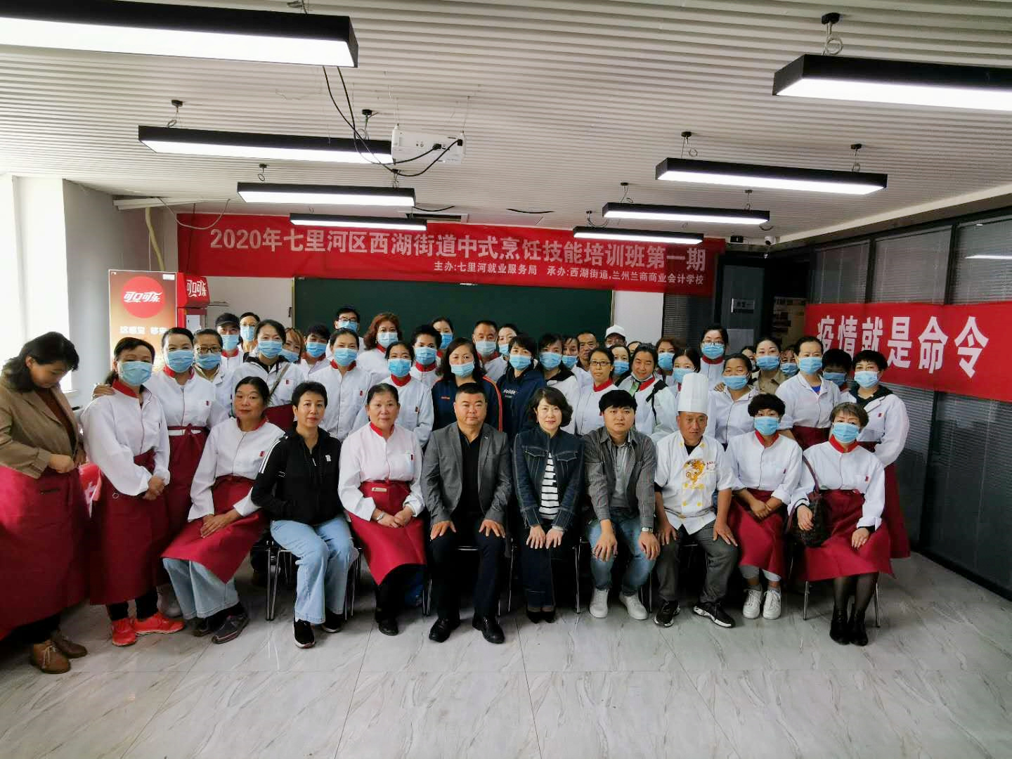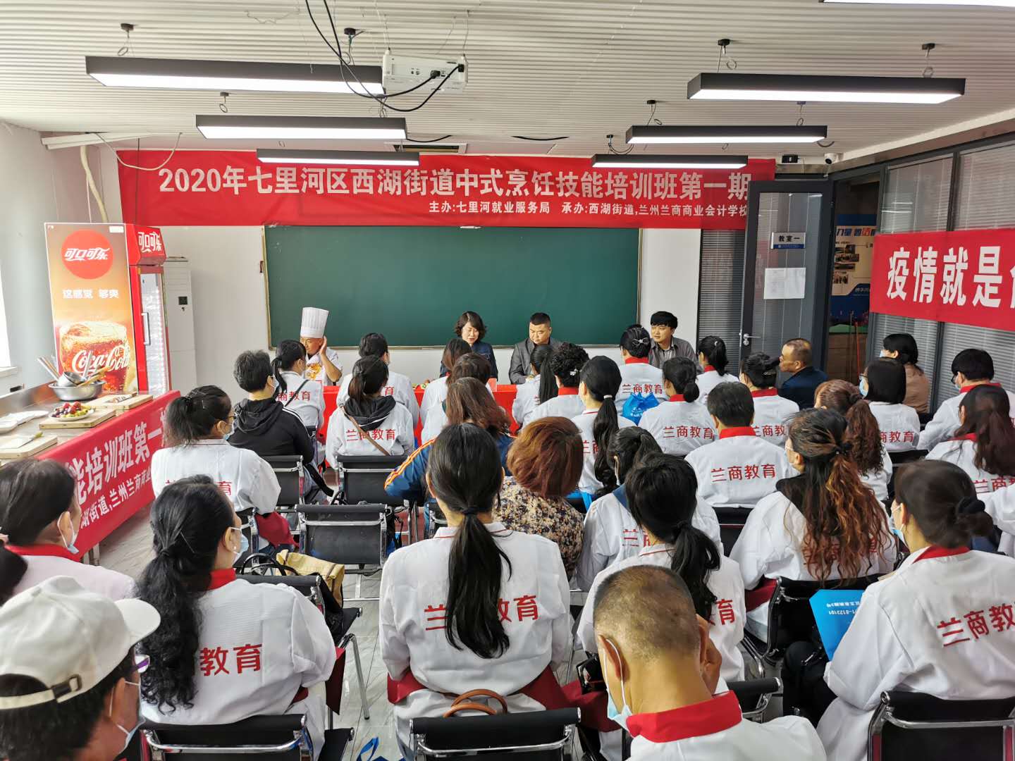 9月15日,由兰州市七里河区就业局主办,西湖街道、兰州兰商商业会计学校承办的2020年七里河区西湖街道中式烹饪技能培训班顺利开班,七里河区就业局主任梅季霞、兰州兰商商业会计校长祁绪、主任王文首、张桂林老师出席了开班仪式。