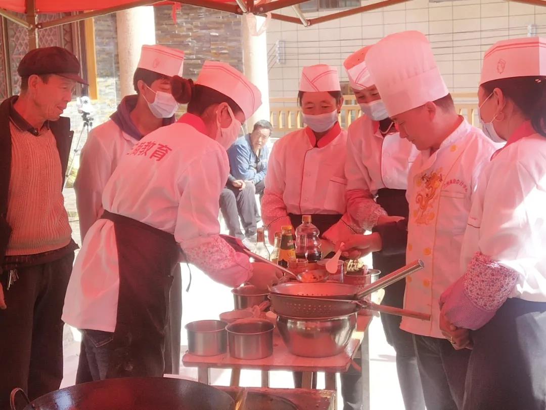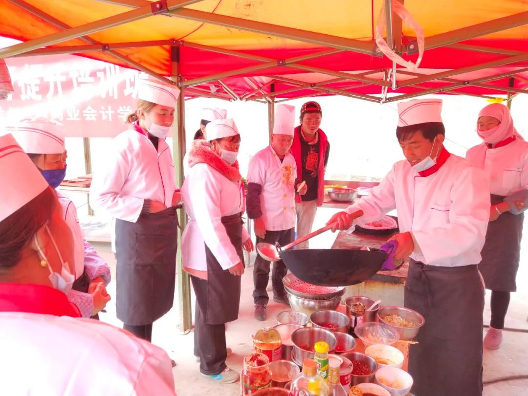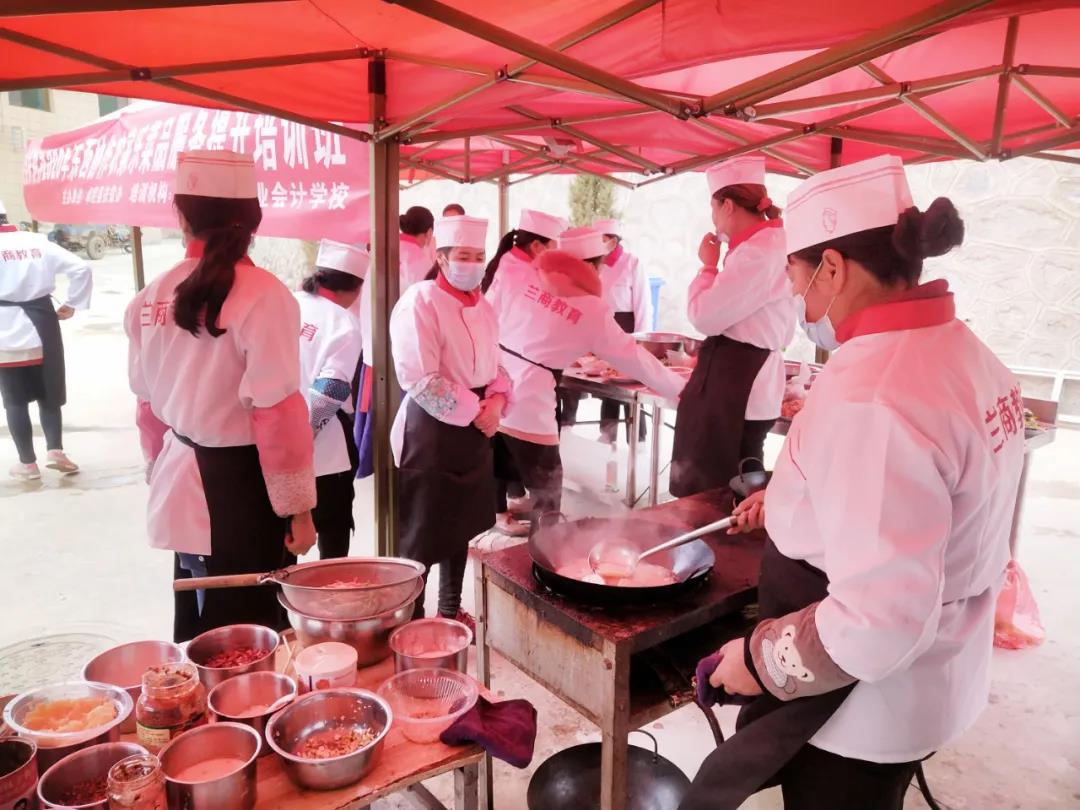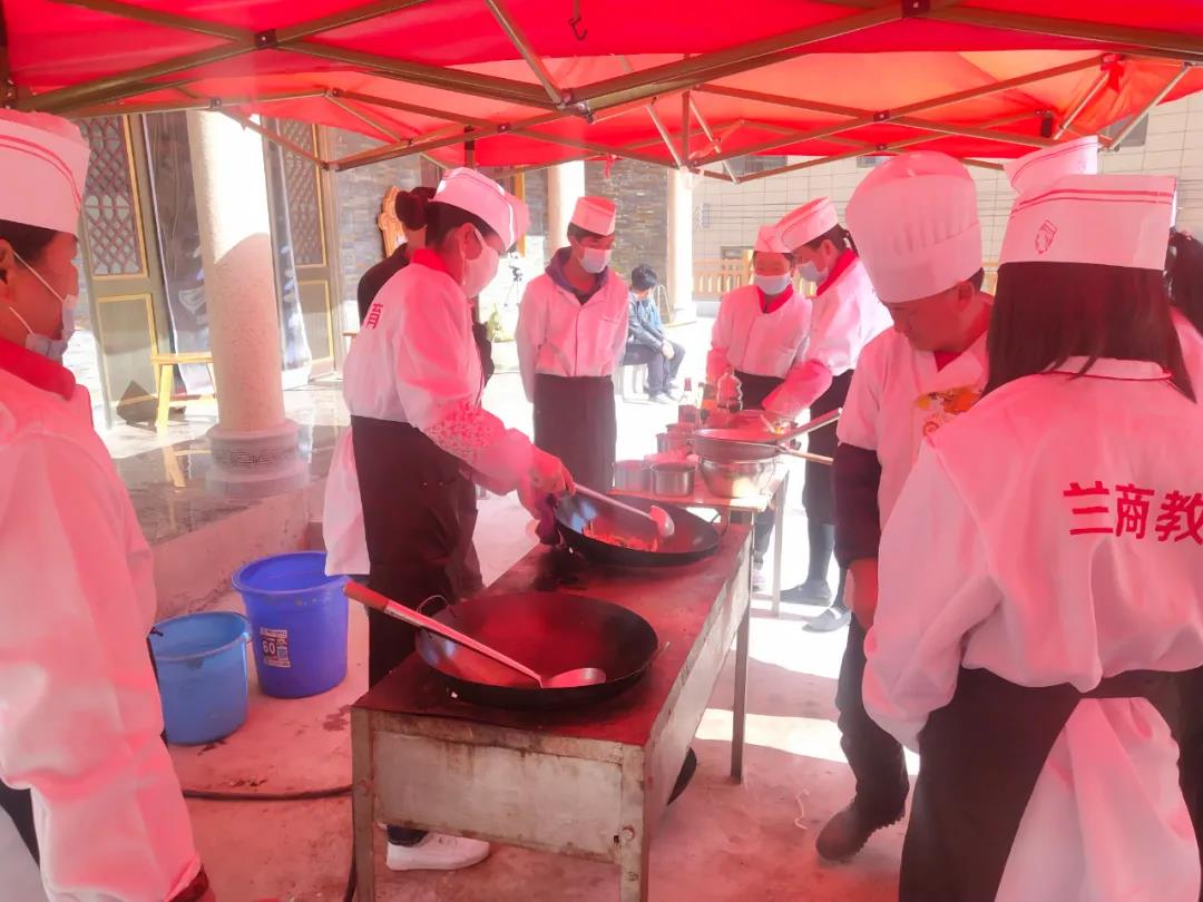 在培训中,兰州兰商商业会计学校老师以“中式烹饪”专业技能为主,详细讲解了中式菜肴菜品的搭配、原材料的制作及烹饪技巧、火候的掌控等厨艺技能,同时利用当地特色食材,创新开发特色菜品,学员们普遍反映通过培训学习及技能操作,理论知识水平和厨师技能、服务技能得到了有效提升。