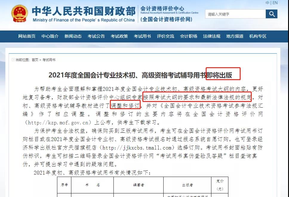 财政部会计资格评价中心发布通知,2021年度全国会计专业技术初、高级资格考试辅导用书即将出版。