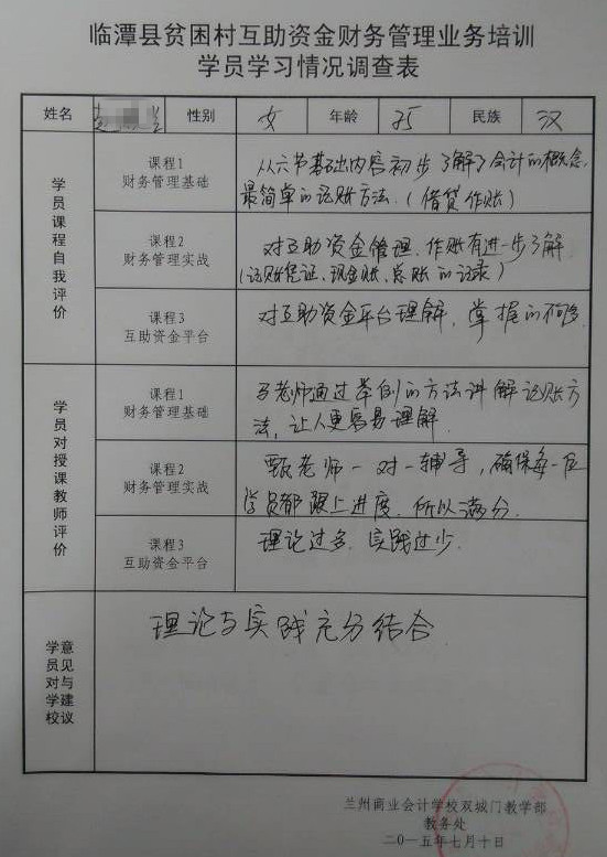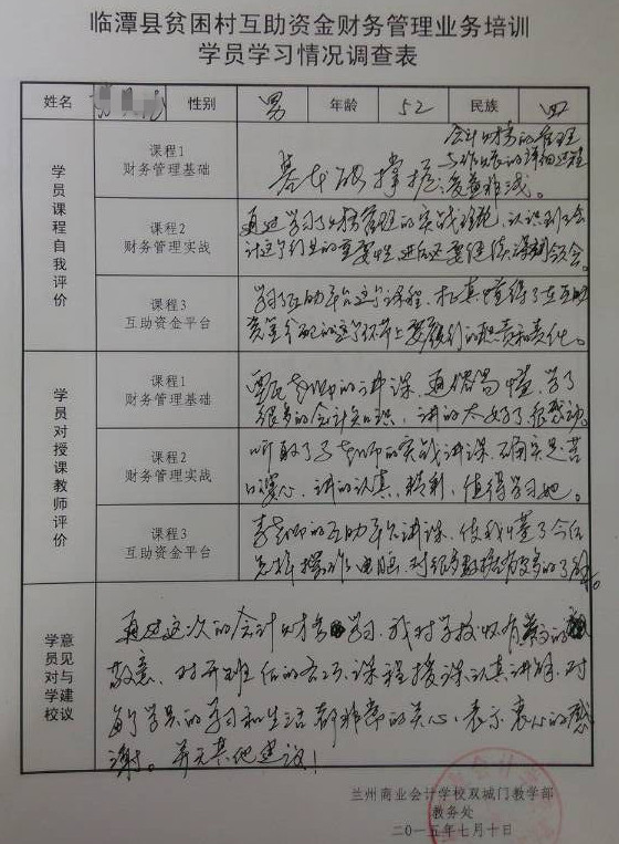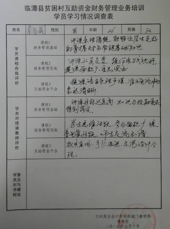 经过为期五天的集中培训,2015年甘南州临潭县互助资金财务管理培训圆满结束,结束后,参训人员认真填写了“临潭县贫困村互助资金财务管理业务培训学员学习情况调查表”,调查表不仅明确反映出参训人员的知识水平和培训效果,同时参训人员也给学校提出了宝贵的意见和建议。小编在此更大家分享一下他们的培训收获: