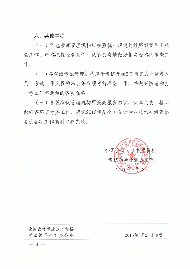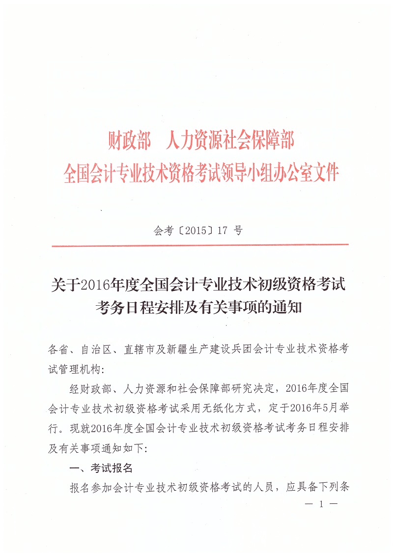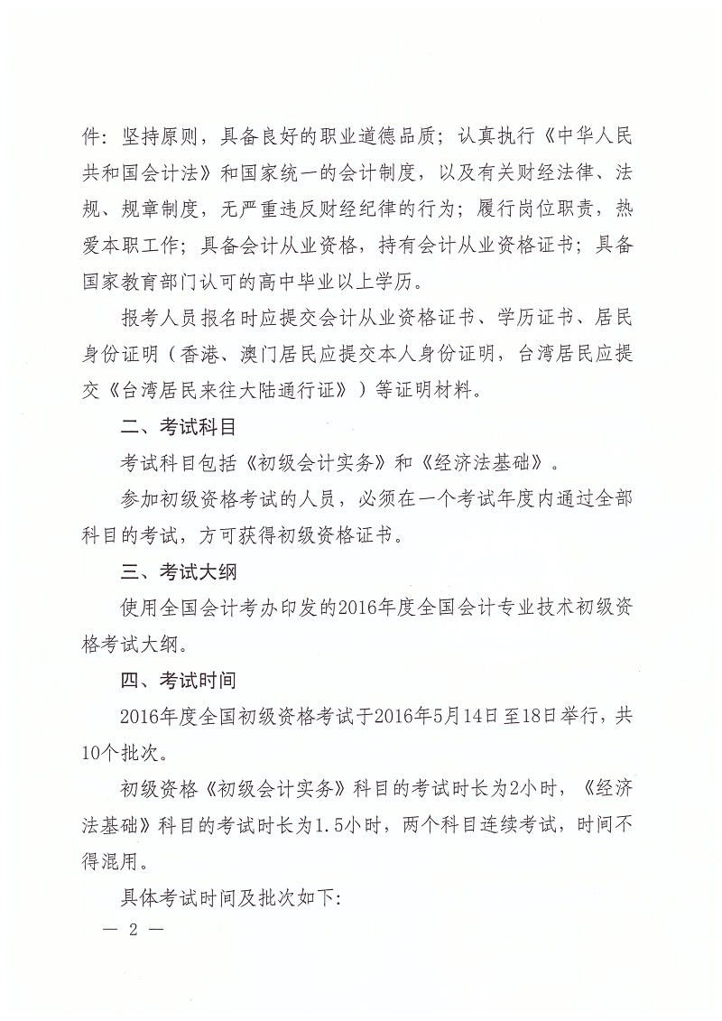 2016年初级考试时间安排及相关通知
