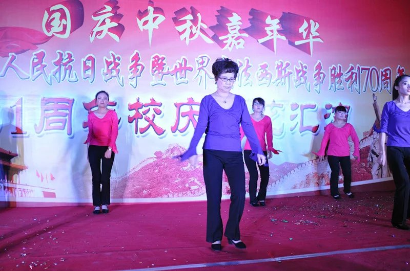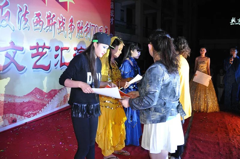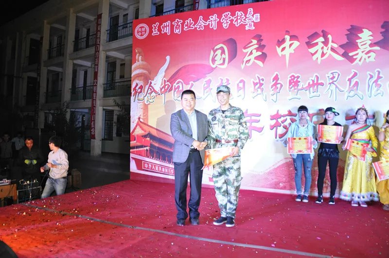 文艺汇演结束以后,进行了校庆颁奖晚会,主持人以幽默风趣的主持风格一一揭晓本次校庆晚会的获奖节目及班级,场上的气氛也随着获奖名单的揭晓再次沸腾,学校校长、副校长、财务及部门主任为获奖班级颁发奖状及奖金,激励学生再接再厉、全面发展。随着颁奖晚会的结束,学校迎国庆、庆校庆、迎新生--纪念中国人民抗日战争大型文艺汇演也画上圆满的句号。