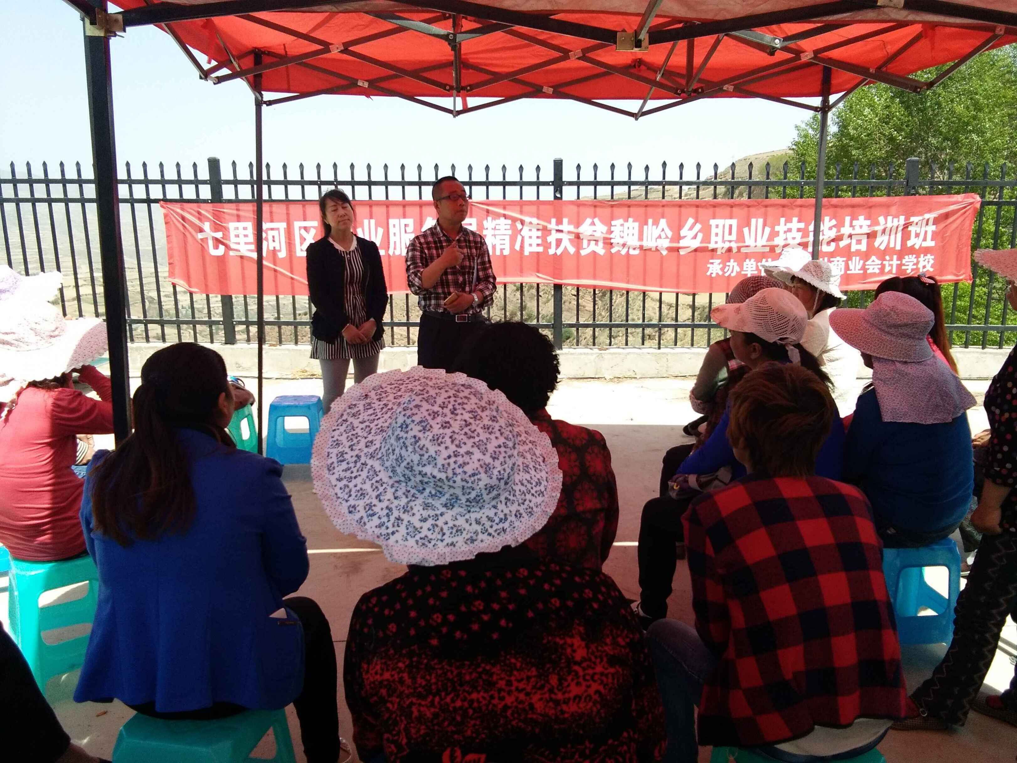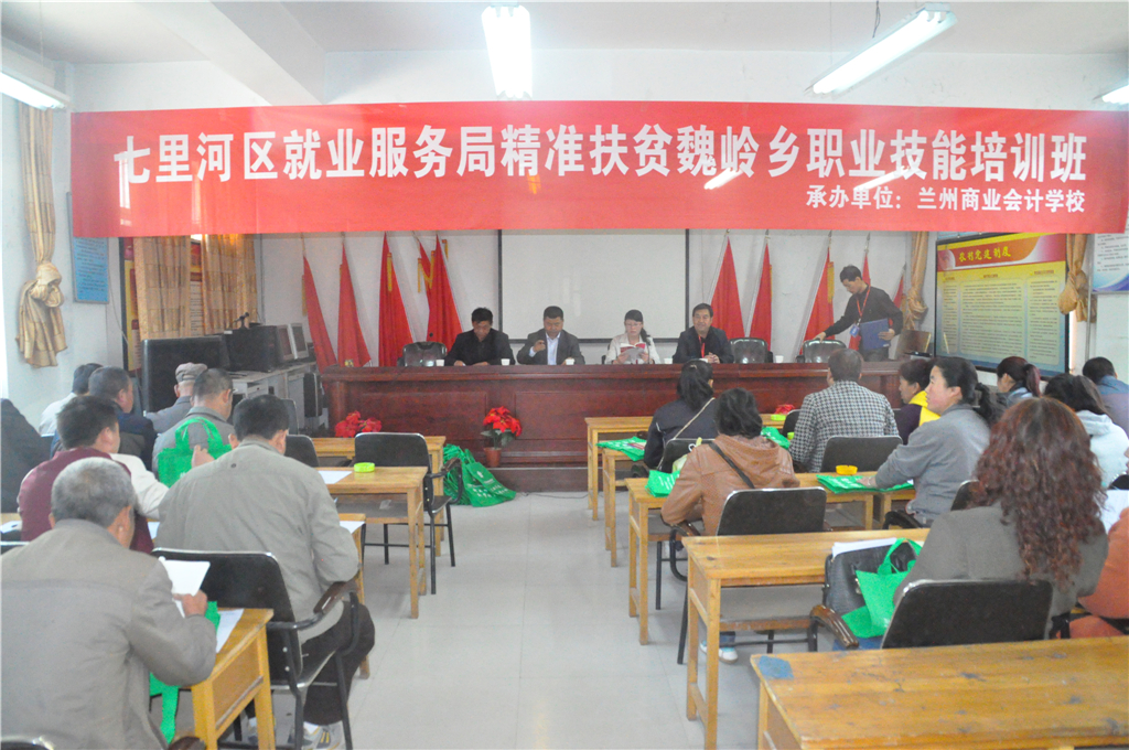 兰州市七里河区就业局委托兰州商业会计学校举办“精准扶贫职业技能培训班”,培训对象为兰州市七里河区魏岭乡八个行政村的精准扶贫建档立卡贫困户,培训人数400多人。培训班于4月27日在兰州市七里河区魏岭乡小山口村举行开班仪式。此次培训是为了达到“培训一人、持证一人、输转一人、致富一家”的目标,使贫困户在拿到技能培训证书的同时,切实掌握职业技能专业知识和实践能力,切实解决贫困户贫困问题。