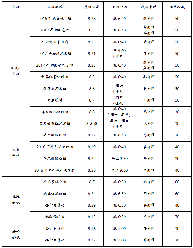 2016年8月份开班计划表