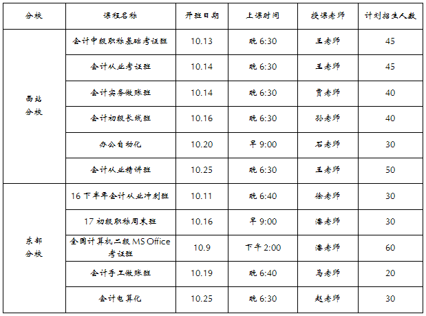2016年10月份开班计划表