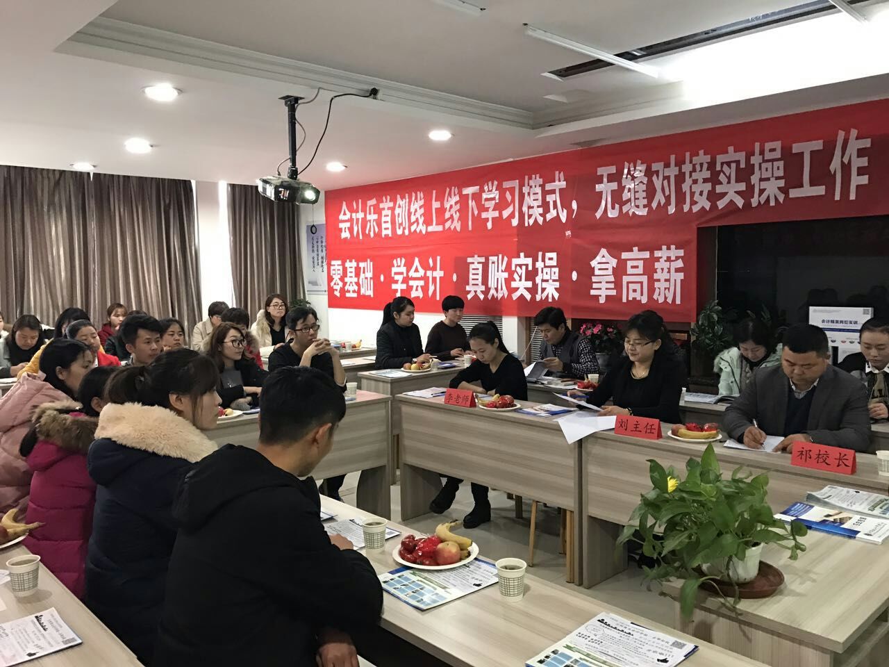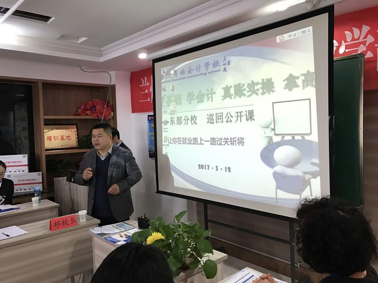 校领导祁校长,销售部刘主任,公开课讲师李老师,莅临我校指导公开课,并且在公开课上进行了演讲,在隆重热烈的气氛中,祁校长主要以2017年以后会计人员的发展改革,国家现如今的会计政策,我校以后的发展方向作以分析,通过举例,祁校长告诉大家国家需要的人才(会计人员)是管理会计,并不单单只是会做账,会做报表的一般会计人员。