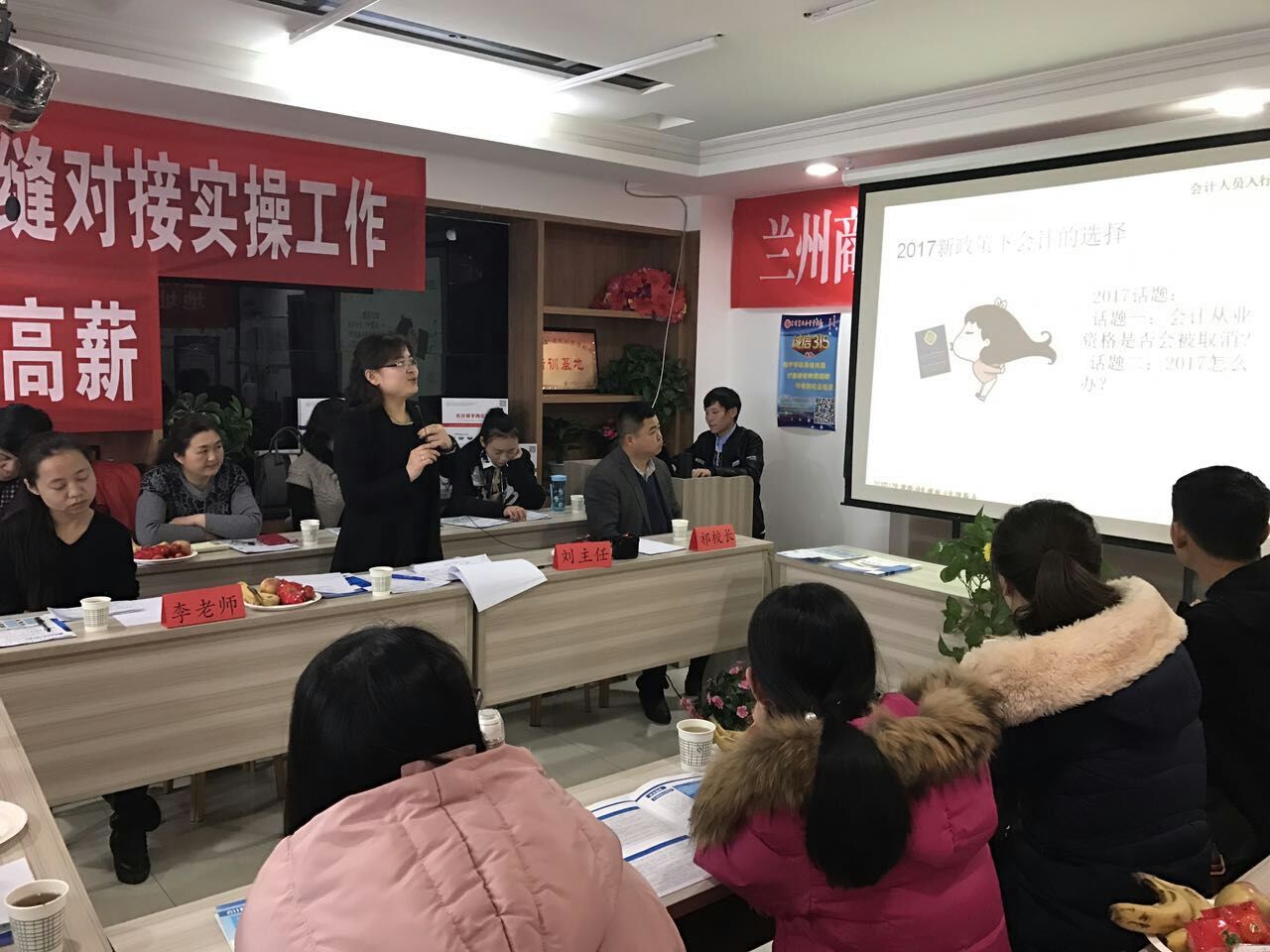 销售部刘主任以PPT的形式对17年兰州市从业暂缓考试,老板需要什么样的会计,会计的五个层次,我校对学员的一站式服务等做了详细的解答。通过生动形象的PPT课件及一张张图片告诉我们就算不考从业证,对会计人员还是没有任何影响,因为老板需要的是可以为企业创造最大化利益,而又降低成本的管理会计人员,最后强调我校以后的宗旨是重实操,重服务,重就业的一站式服务。