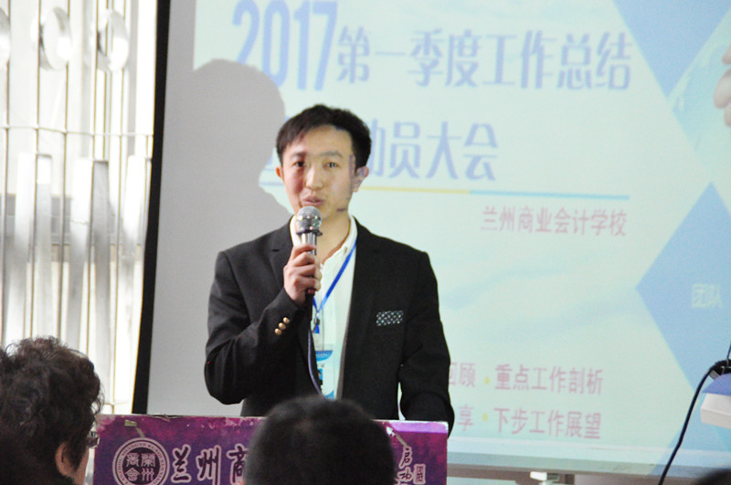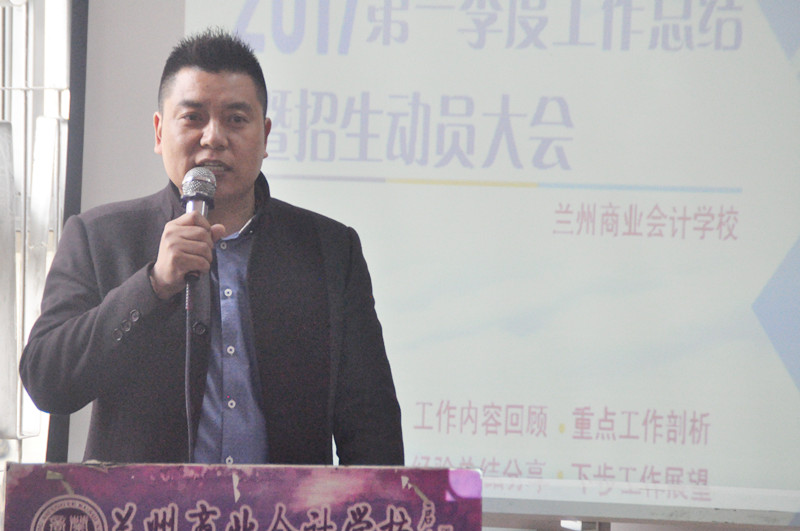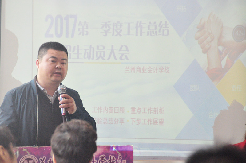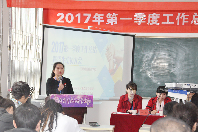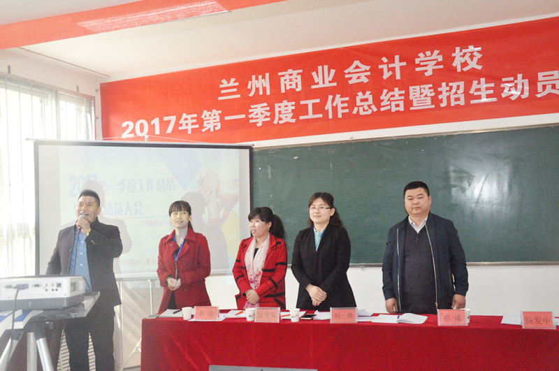 在春光明媚、万物复苏的斑斓季节,我校于2017年3月31日早上在双城门校区召开了“兰州商业会计学校2017年第一季度工作总结暨招生动员大会”,我校校长祁绪、副校长杨发中、销售部刘一燕主任、教务部赵雪琴主任以及我校各培训分部主任及全体员工出席了此次大会,大会由综合办公室主任李琪主持召开。(会议现场) (参会领导)