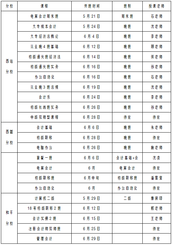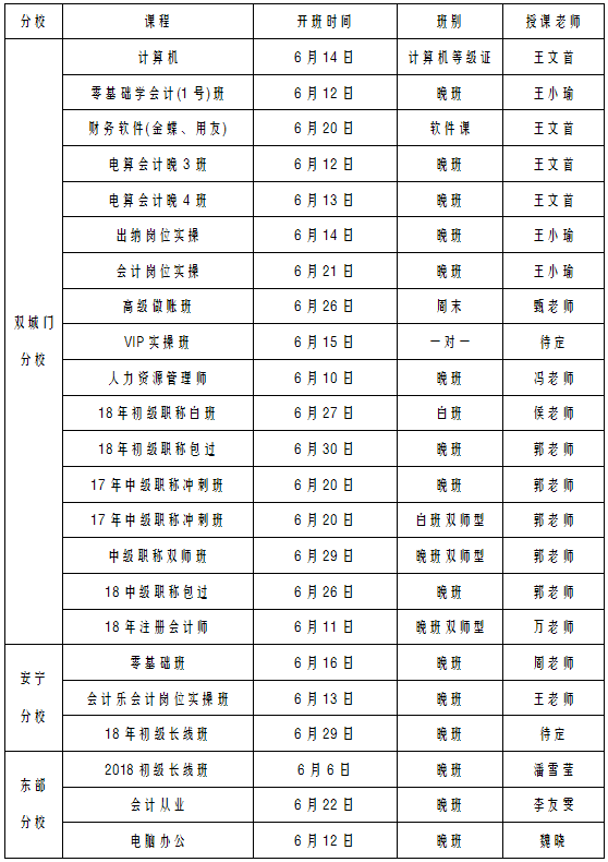 我校各分校6月份开课计划